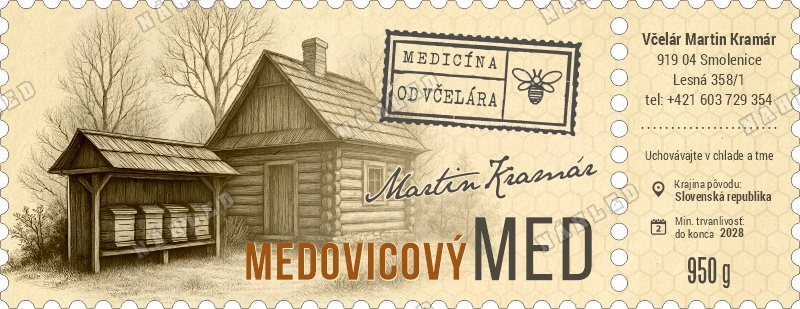 Etikety na med sú samolepiace o rozmere 140x54mm. Etiketa má efektné zubatý okraj ako poštová známka a možno aj jednoducho odtrhnúť pravú časť známky s kontakty a povinnými údajmi pre jej nalepenie na iné miesto. Etiketa po odtrhnutí pravej časti stále vyzerá tak ako má keďže odtrhnutá časť má tiež rovnaký okraj.