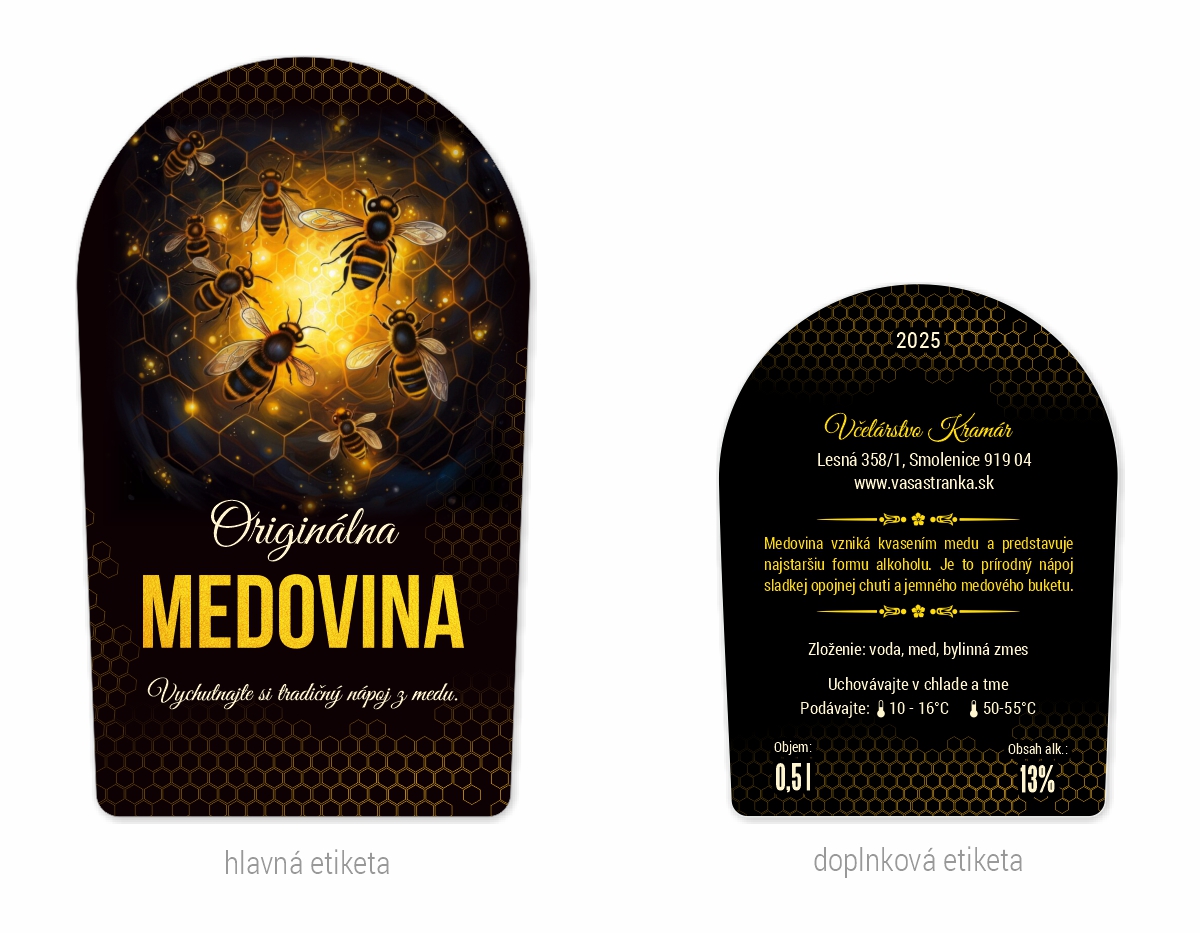 Etiketa na fľašu medoviny veľkostí napríklad 0,5l, 0,75l alebo 1l.Etikety sú samolepiace s rozmermi 68x114mm a 60x80mm.Etikety vám upravíme podľa požiadavky, zmeniť je možné parametre viď vieše.Tieto úpravy zadáte v detaile etikety a sú zadarmo.