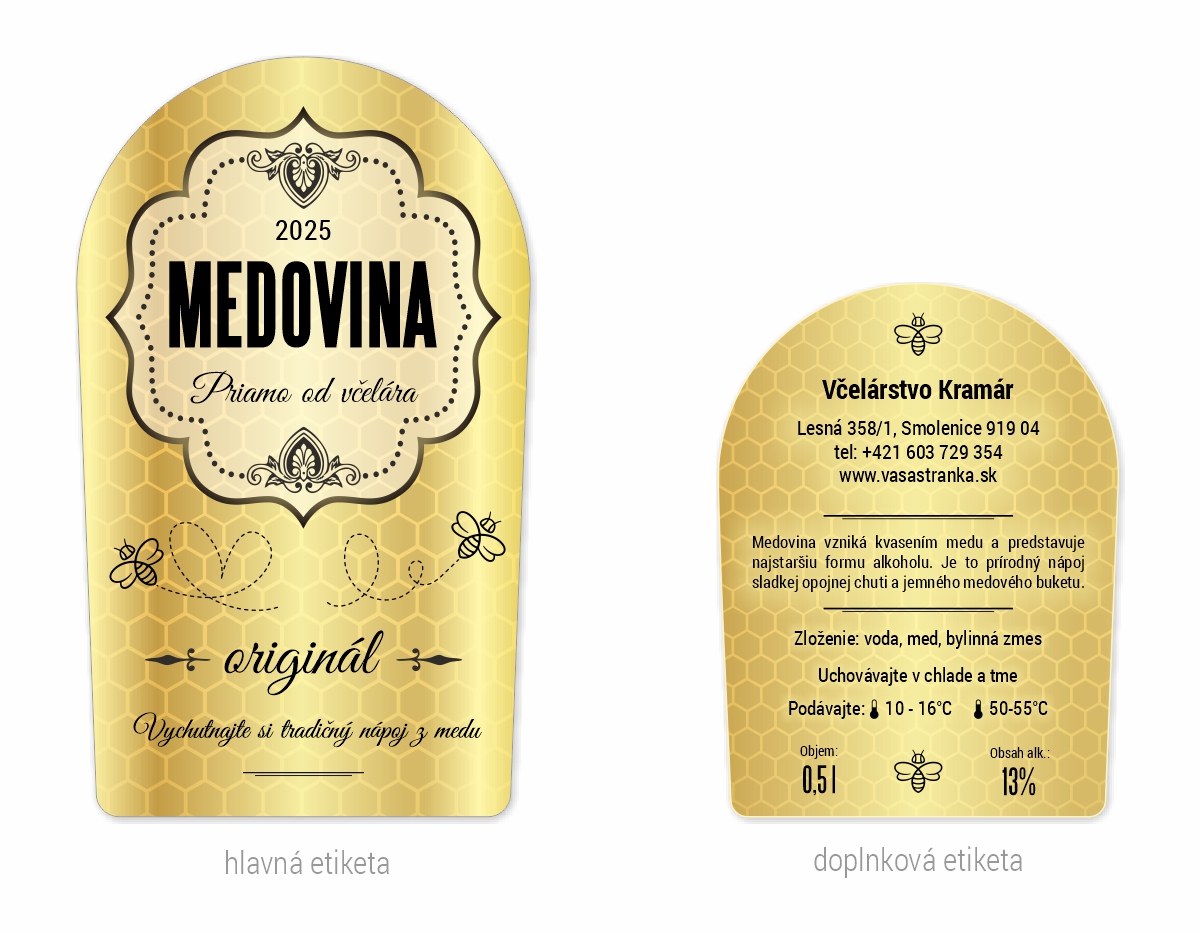 Etiketa na fľašu medoviny veľkostí napríklad 0,5l, 0,75l alebo 1l.Etikety sú samolepiace s rozmermi 68x114mm a 60x80mm.Etikety vám upravíme podľa požiadavky, zmeniť je možné parametre viď vieše.Tieto úpravy zadáte v detaile etikety a sú zadarmo.