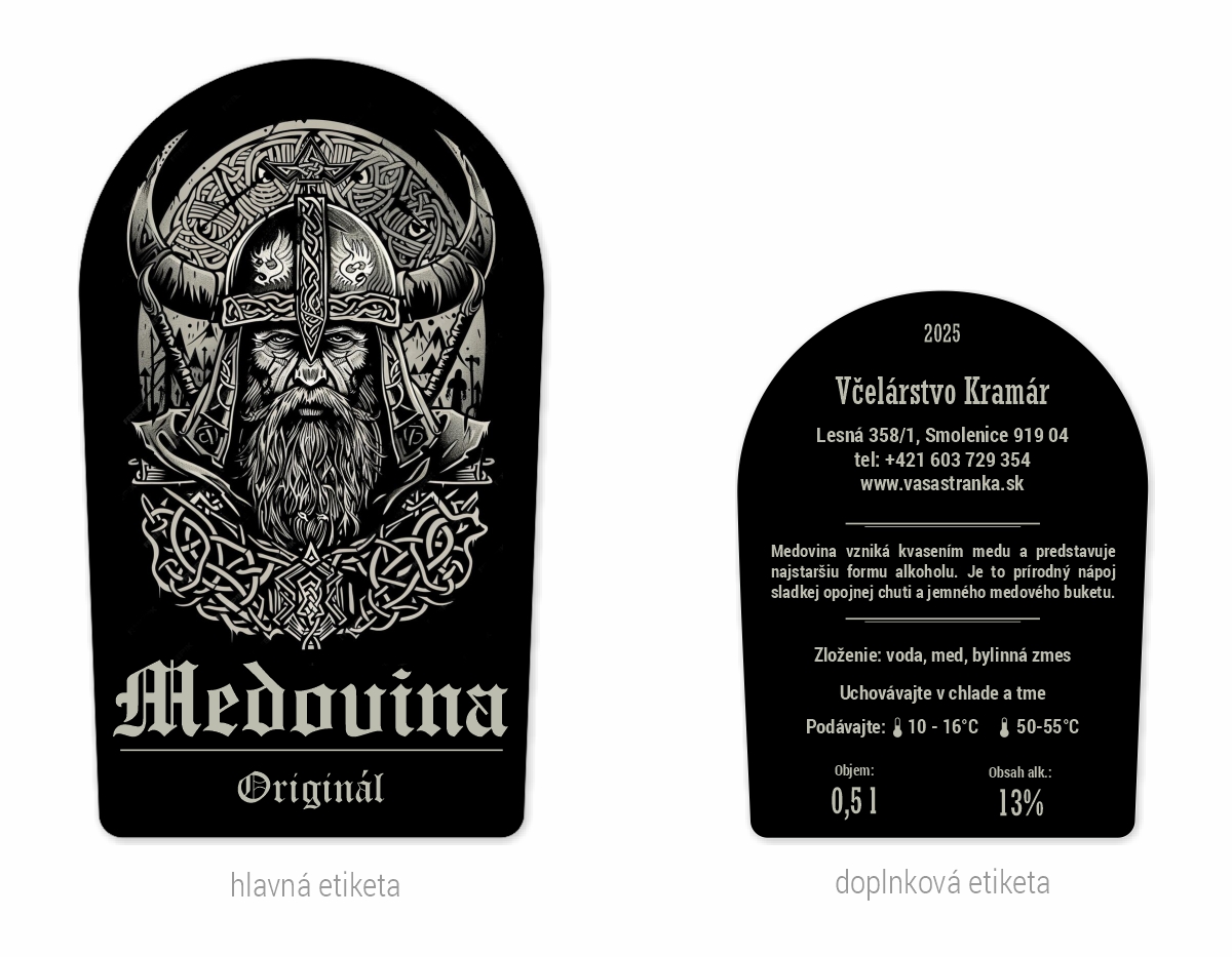 Etiketa na fľašu medoviny veľkostí napríklad 0,5l, 0,75l alebo 1l.Etikety sú samolepiace s rozmermi 68x114mm a 60x80mm.Etikety vám upravíme podľa požiadavky, zmeniť je možné parametre viď vieše.Tieto úpravy zadáte v detaile etikety a sú zadarmo.