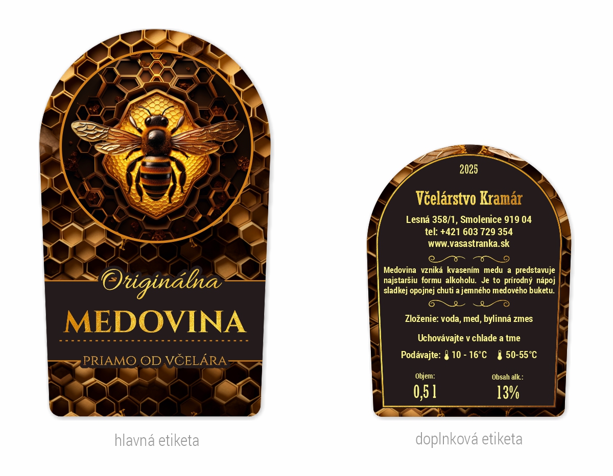 Etiketa na fľašu medoviny veľkostí napríklad 0,5l, 0,75l alebo 1l.Etikety sú samolepiace s rozmermi 68x114mm a 60x80mm.Etikety vám upravíme podľa požiadavky, zmeniť je možné parametre viď vieše.Tieto úpravy zadáte v detaile etikety a sú zadarmo.