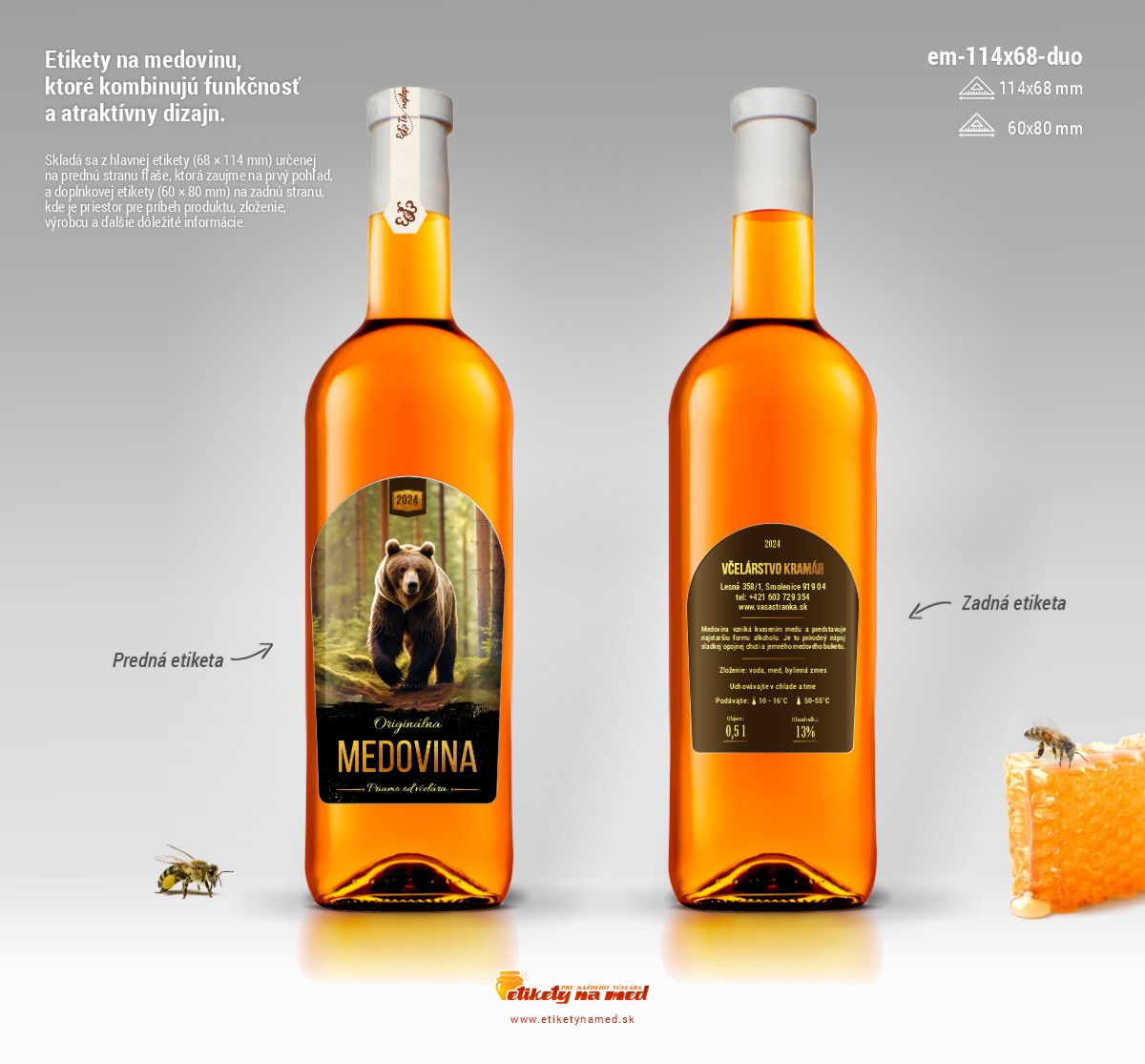 Etiketa na fľašu medoviny veľkostí napríklad 0,5l, 0,75l alebo 1l.Etikety sú samolepiace s rozmermi 68x114mm a 60x80mm.Etikety vám upravíme podľa požiadavky, zmeniť je možné parametre viď vieše.Tieto úpravy zadáte v detaile etikety a sú zadarmo.