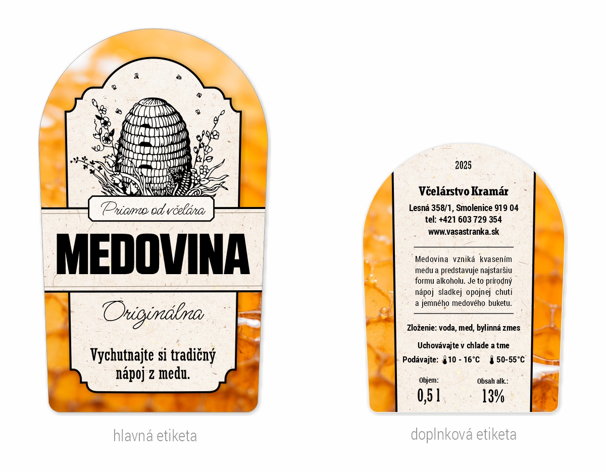 Etiketa na fľašu medoviny veľkostí napríklad 0,5l, 0,75l alebo 1l.Etikety sú samolepiace s rozmermi 68x114mm a 60x80mm.Etikety vám upravíme podľa požiadavky, zmeniť je možné parametre viď vieše.Tieto úpravy zadáte v detaile etikety a sú zadarmo.