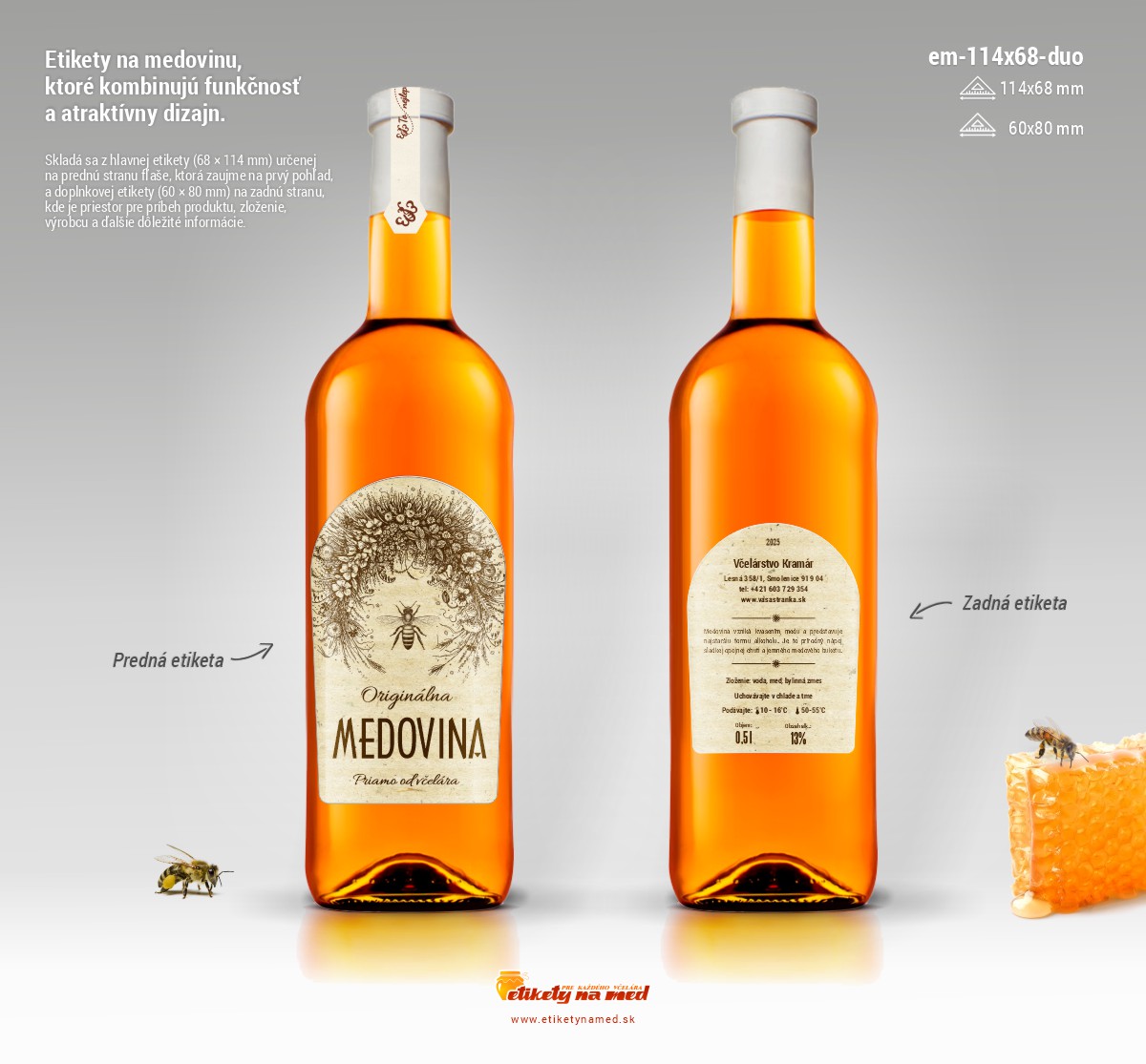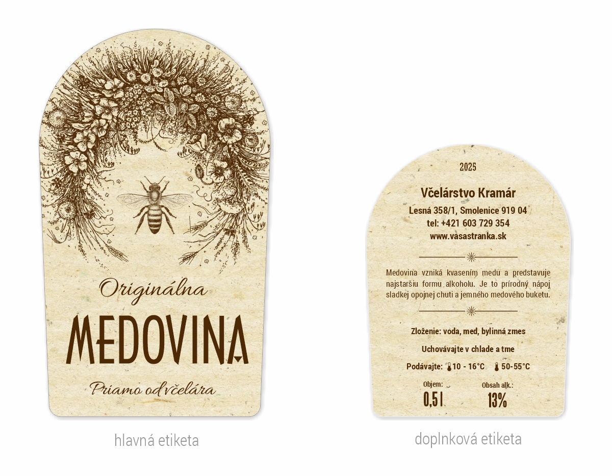 Etiketa na fľašu medoviny veľkostí napríklad 0,5l, 0,75l alebo 1l.Etikety sú samolepiace s rozmermi 68x114mm a 60x80mm.Etikety vám upravíme podľa požiadavky, zmeniť je možné parametre viď vieše.Tieto úpravy zadáte v detaile etikety a sú zadarmo.