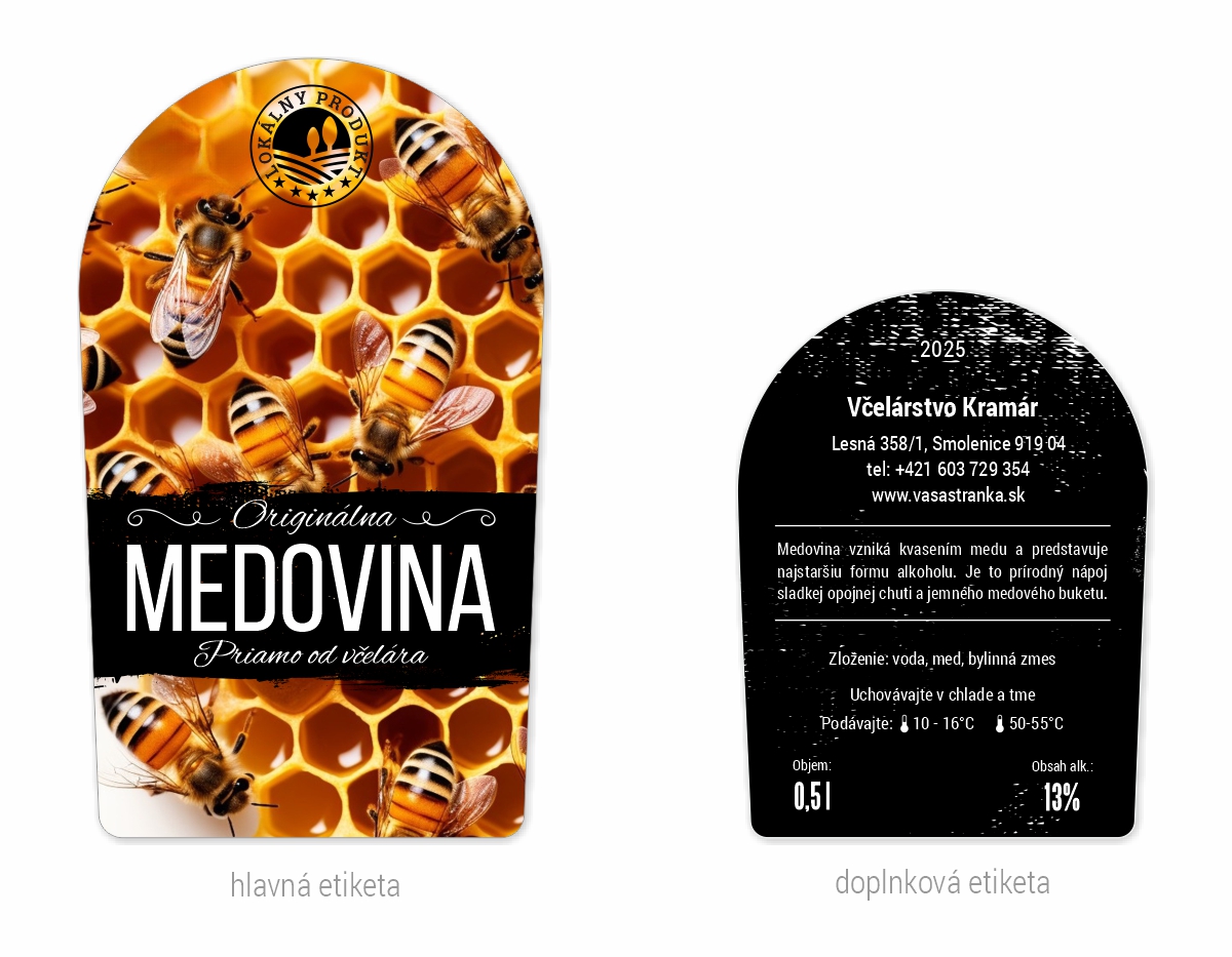 Etiketa na fľašu medoviny veľkostí napríklad 0,5l, 0,75l alebo 1l.Etikety sú samolepiace s rozmermi 68x114mm a 60x80mm.Etikety vám upravíme podľa požiadavky, zmeniť je možné parametre viď vieše.Tieto úpravy zadáte v detaile etikety a sú zadarmo.