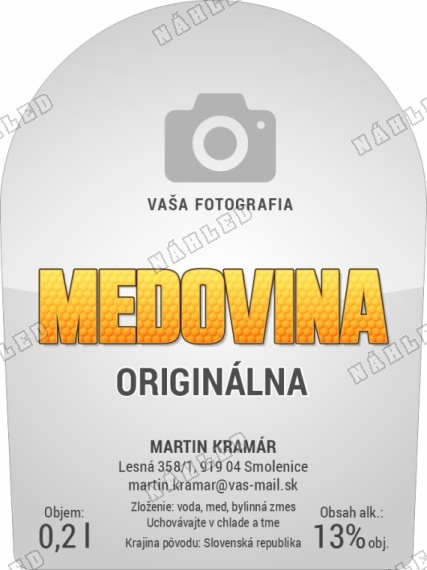 Etiketa na fľašu medoviny. Etiketa je samolepiaca o rozmere 60x80mm. Etiketu vám upravíme podľa požiadavky, zmeniť je možné parametre viď víše. Tieto úpravy zadáte v detaile každej etikety a sú zadarmo.