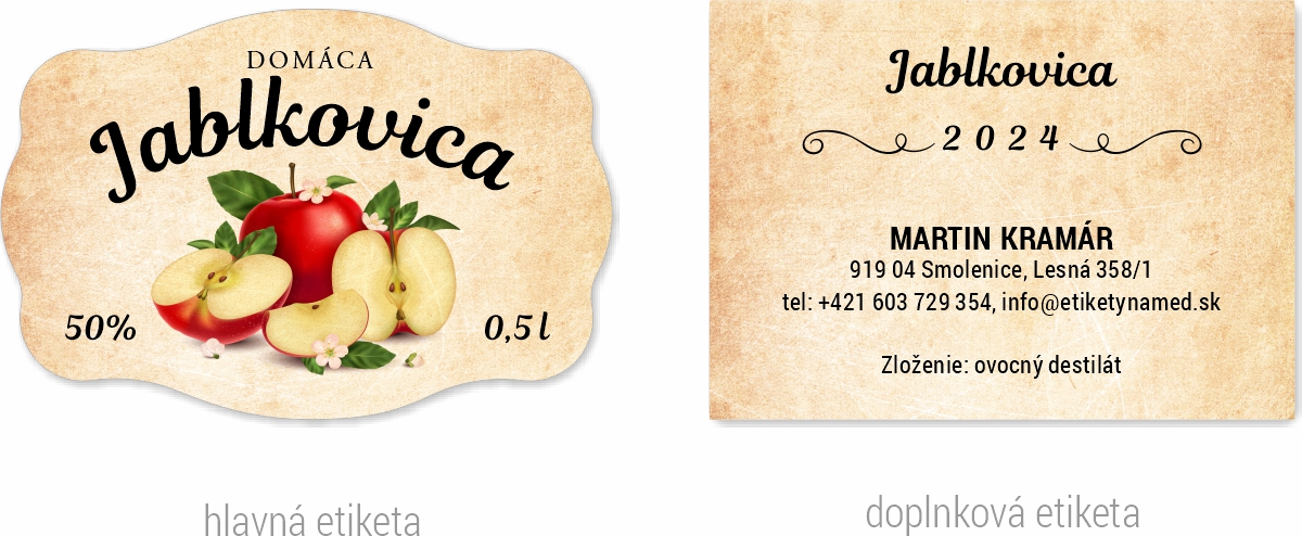 Etiketa na fľaše s objemom napríklad 0,5l, 0,75l alebo 1l. Etikety sú samolepiace s rozmermi 70x47mm a 48x67mm. Etikety vám upravíme podľa požiadavky, zmeniť je možné parametre viď vieše. Tieto úpravy zadáte v detaile etikety a sú zadarmo.