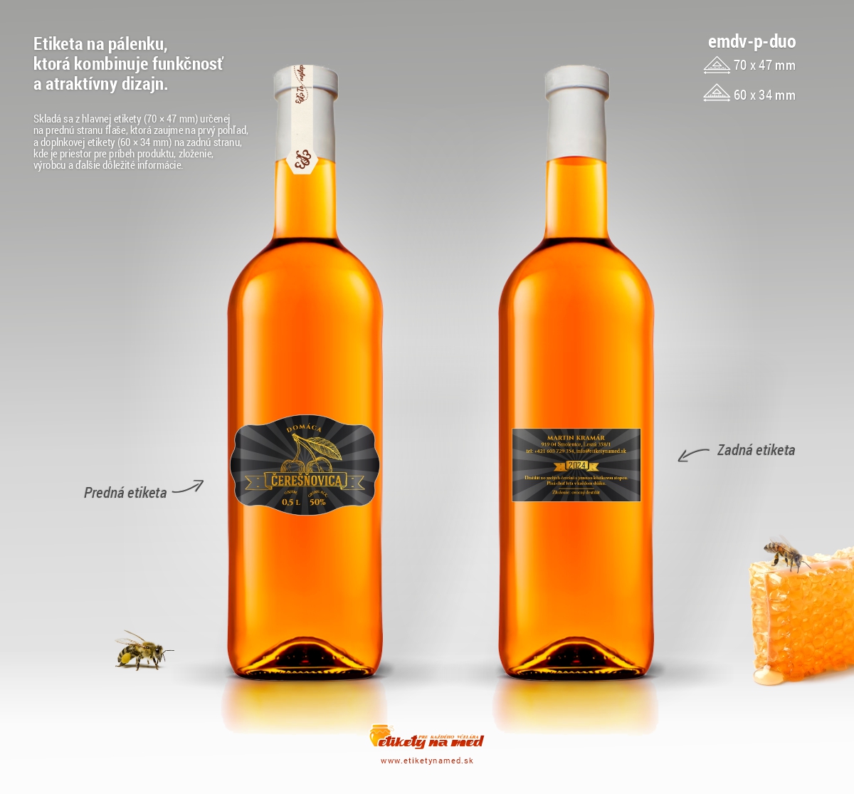 Etiketa na fľaše s objemom napríklad 0,5l, 0,75l alebo 1l. Etikety sú samolepiace s rozmermi 70x47mm a 48x67mm. Etikety vám upravíme podľa požiadavky, zmeniť je možné parametre viď vieše. Tieto úpravy zadáte v detaile etikety a sú zadarmo.