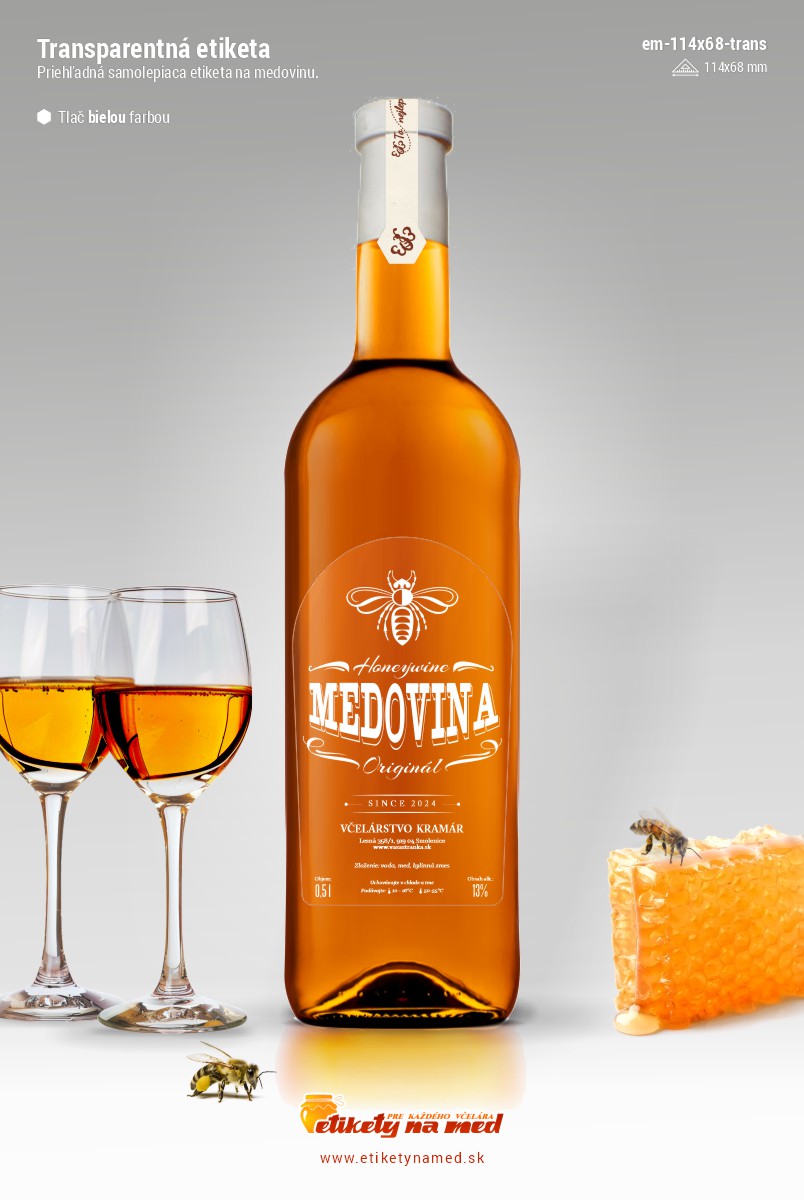 Úvod > Transparentné etikety na med > Transparentné etikety na medovinu zaoblené 68x114mm - tlač bielu