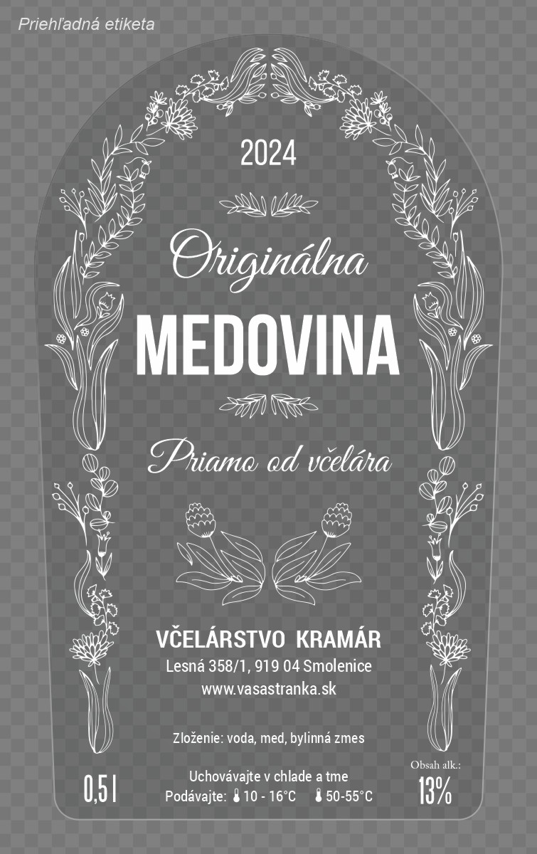 Etiketa na fľašu medoviny s objemom napríklad 0,5l, 0,75l alebo 1l. Ak sa vám táto etiketa páči a chceli by ste jej aj v inom formáte/rozmere z našej ponuky, nie je to problém, radi vám ju upravíme Stačí si vybrať vami požadovaný rozmer etikety v sekcii Etikety s vašou grafikou a objednať.