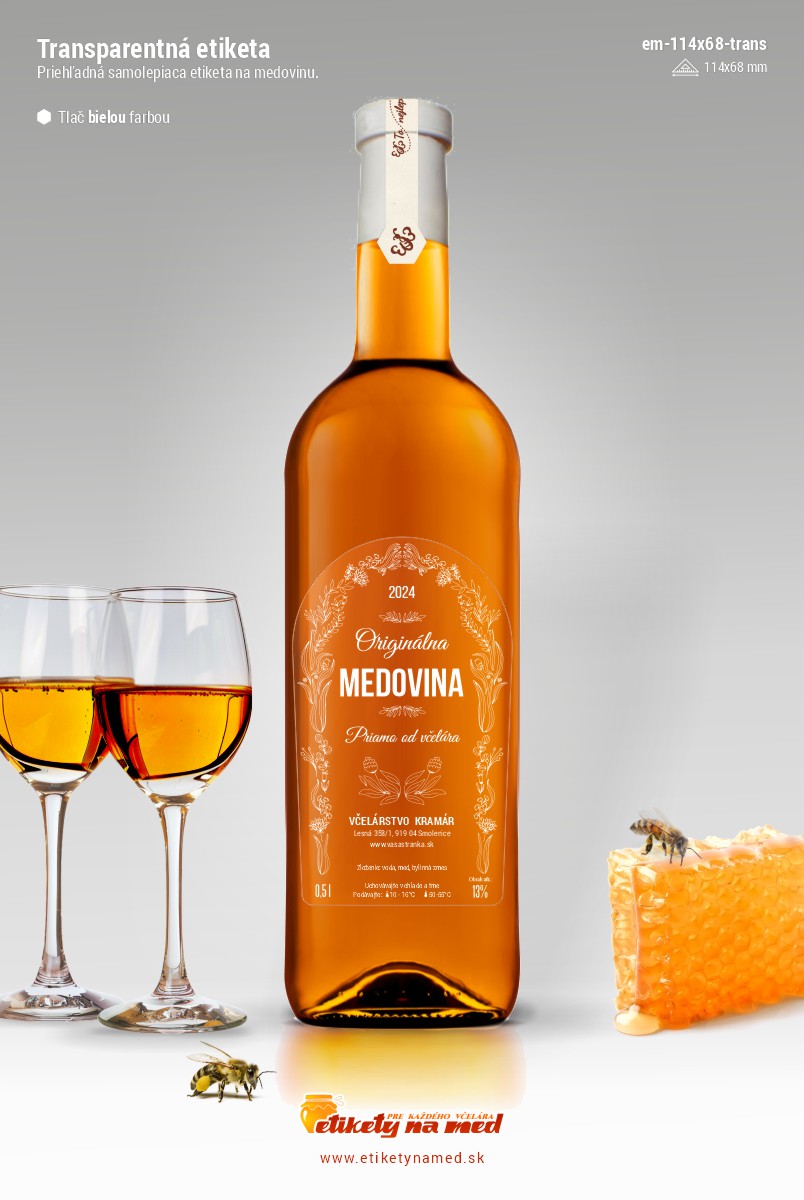 Úvod > Transparentné etikety na med > Transparentné etikety na medovinu zaoblené 68x114mm - tlač bielu