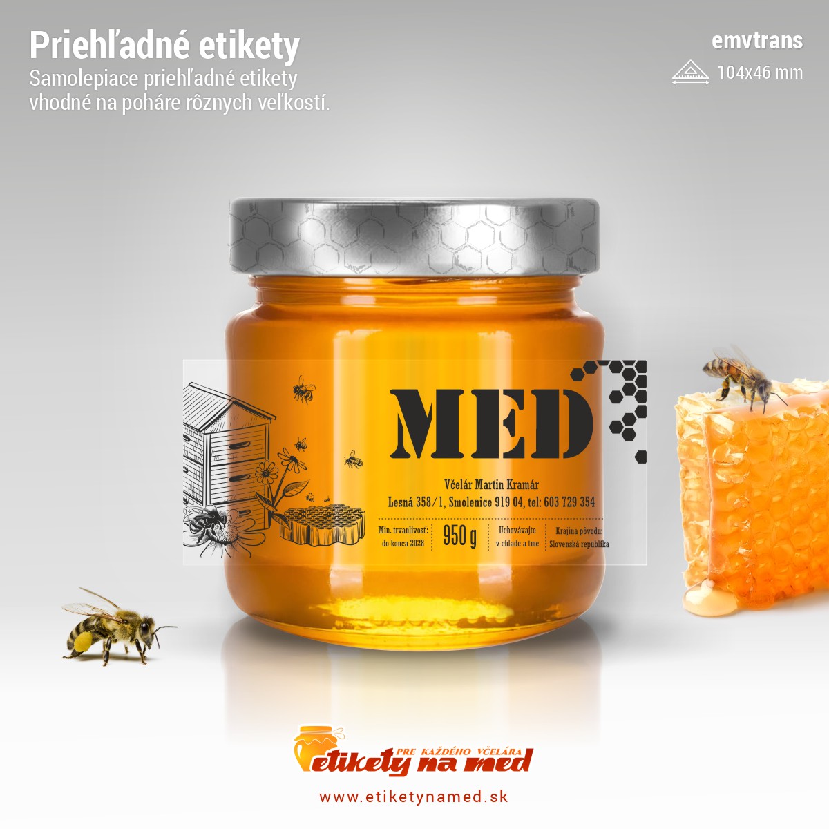 Transparentné priehľadné číre samolepiace etikety na med veľké, vhodné pre poháre 720ml alebo 730ml a iné poháre väčšieho aj menšieho rozmeru. Etikety sú priehľadné a samolepiace o rozmere 104x46mm.