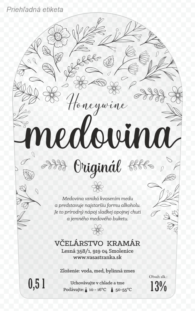 Etiketa na fľašu medoviny s objemom napríklad 0,5l, 0,75l alebo 1l. Ak sa vám táto etiketa páči a chceli by ste jej aj v inom formáte/rozmere z našej ponuky, nie je to problém, radi vám ju upravíme Stačí si vybrať vami požadovaný rozmer etikety v sekcii Etikety s vašou grafikou a objednať.