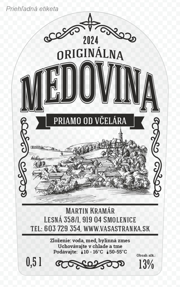Etiketa na fľašu medoviny s objemom napríklad 0,5l, 0,75l alebo 1l. Ak sa vám táto etiketa páči a chceli by ste jej aj v inom formáte/rozmere z našej ponuky, nie je to problém, radi vám ju upravíme Stačí si vybrať vami požadovaný rozmer etikety v sekcii Etikety s vašou grafikou a objednať.